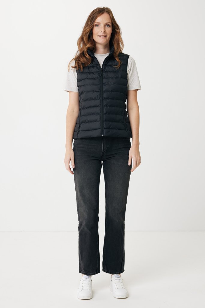 Women’s medium fit bodywarmer made from 100% post-consumer recycled polyester. The bodywarmer is fully quilted with 100% recycled polyester pearl filling. It has a reversed zipper at the front and practical zip pockets in the side panel seams. All zippers have extra zip pullers in matching colour for a refined look. The armholes have elastic binding and all seams at the inside are clean finished with recycled binding. Fluorine/PFAS free water repellent impregnation. The use of genuine recycled fabric materials and environmental impact claims are guaranteed, by using the AWARE™ disruptive physical tracer and blockchain technology. By scanning the QR code, you will gain access to a dedicated digital passport. 2% of proceeds of each sold product will be donated to Water.org. This product is OEKO-TEX® STANDARD 100 certified. The Meru bodywarmer is also available in men fit.
