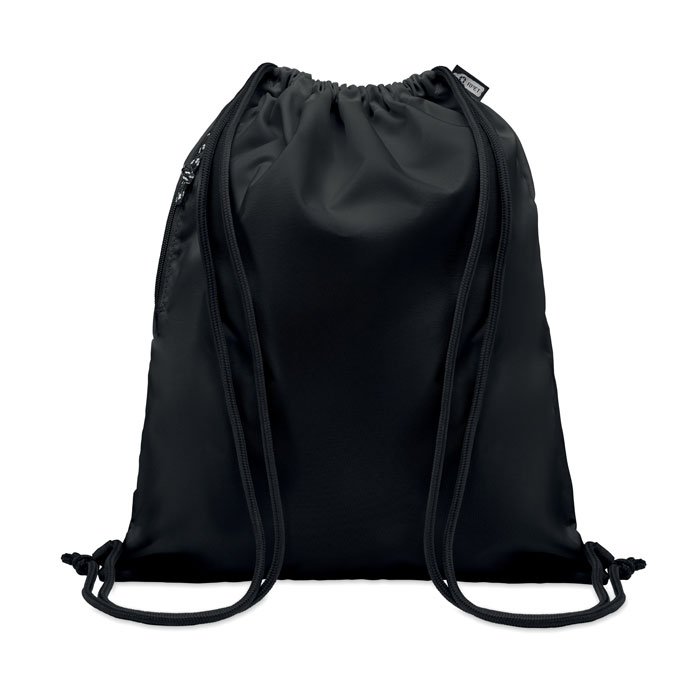 Large drawstring bag in 300D RPET polyester with side zippered outer pocket.