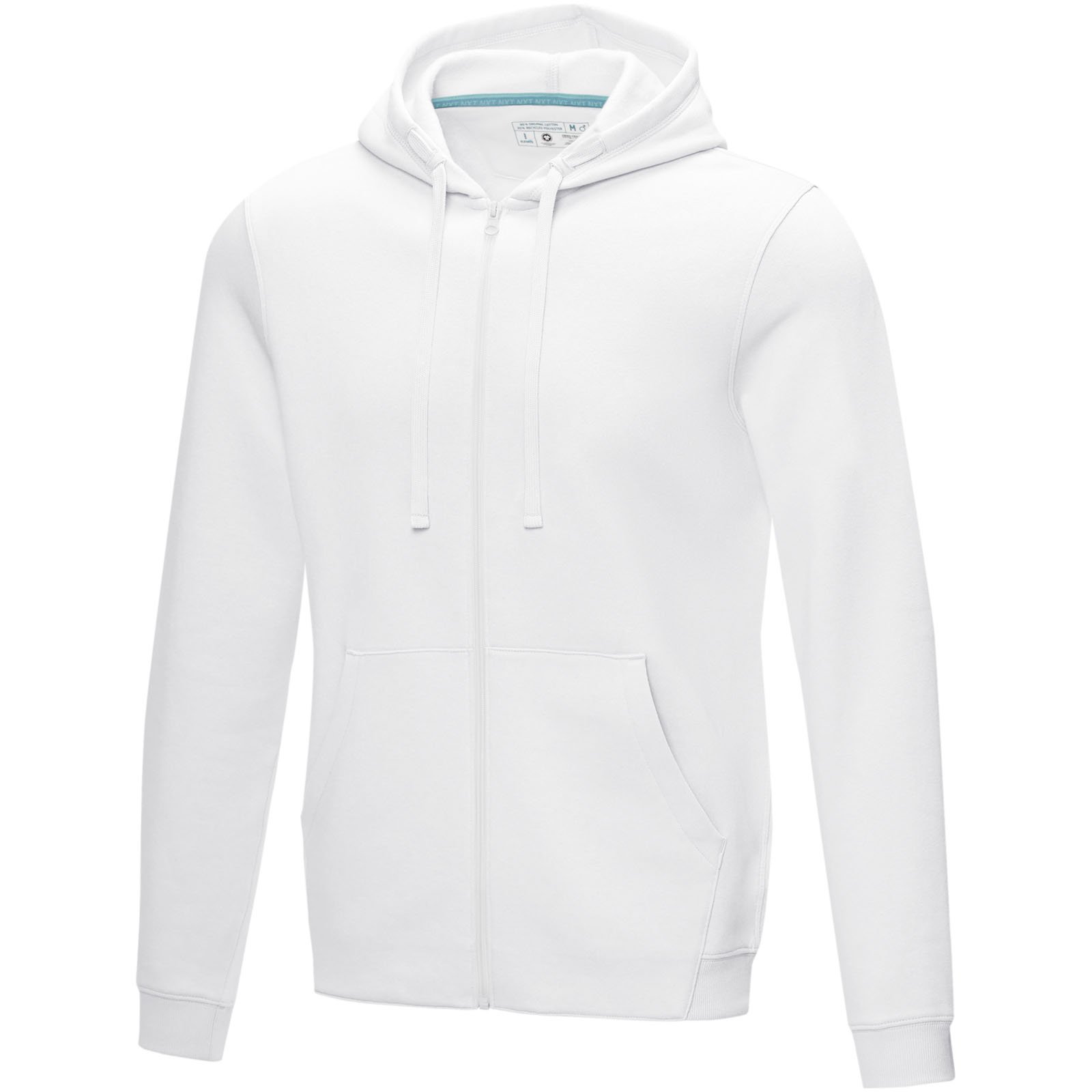 Sustainable promotional apparel. Centre front GRS certified coil zipper. GOTS certified drawstring in hood. Kangaroo pocket. Brushed on the inside. Flat knit rib cuffs. Flat knit rib bottom hem. Bi-coloured branded necktape. Half moon. Heat transfer main label for tagless comfort.