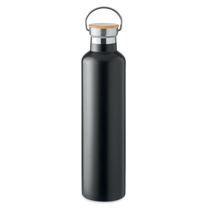 Double wall Stainless Steel insulating vacuum flask with bamboo lid and carry handle. Capacity: 1L.