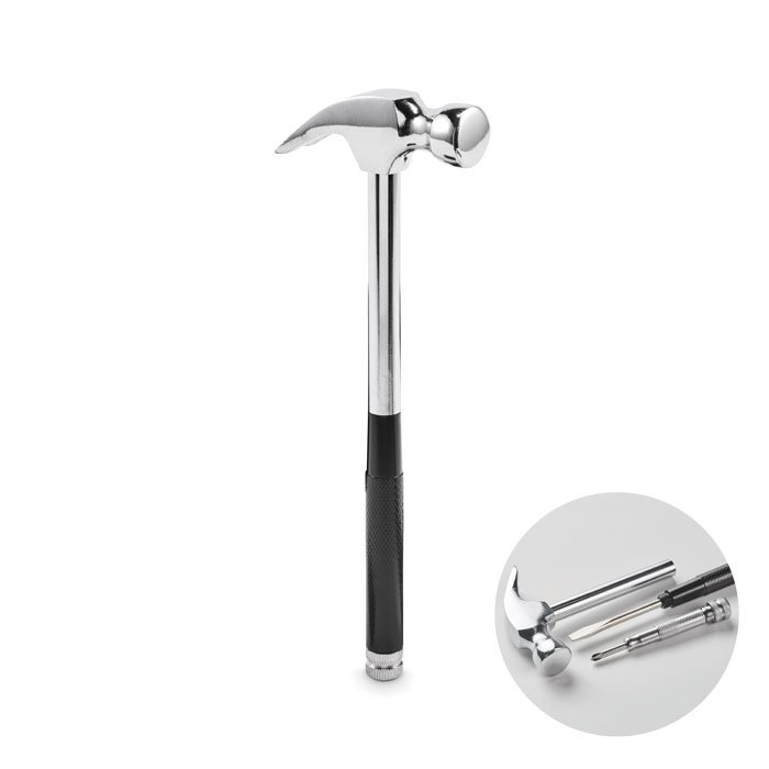 Claw hammer and screwdriver in carbon steel. Includes 4 bits screwdrivers integrated in handle.