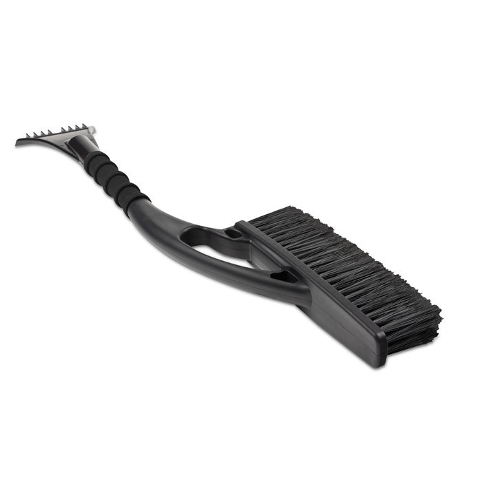 Snow brush in PET with soft finish hair on the tips with integrated ice scraper in ABS and foam grip handle.