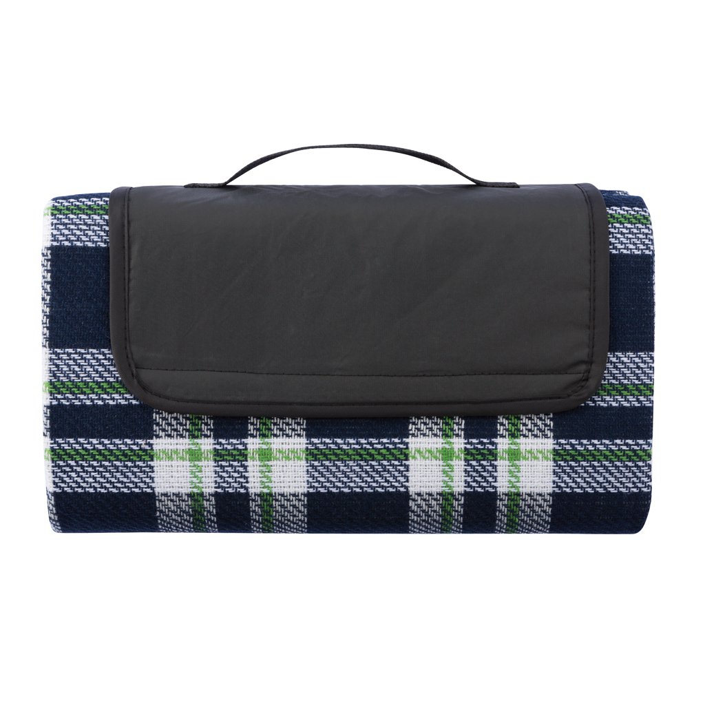 Traditional styled blanket, size 130x145cm, top woven acrylic 120gsm coloured square pattern, back of blanket is waterproof PVC 110gsm.