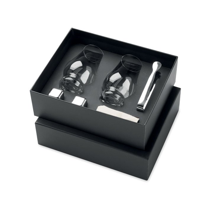 Set of 2 sniffer tasting glasses (200ml) for whisky or other liquors, 2 reusable stainless steel ice cubes, tongs and ice cube storage cotton pouch. Presented in gift box.