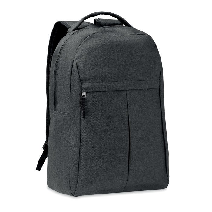 Backpack in 600D RPET 2 tone polyester with outside pocket with zipper and mesh pocket on the side.